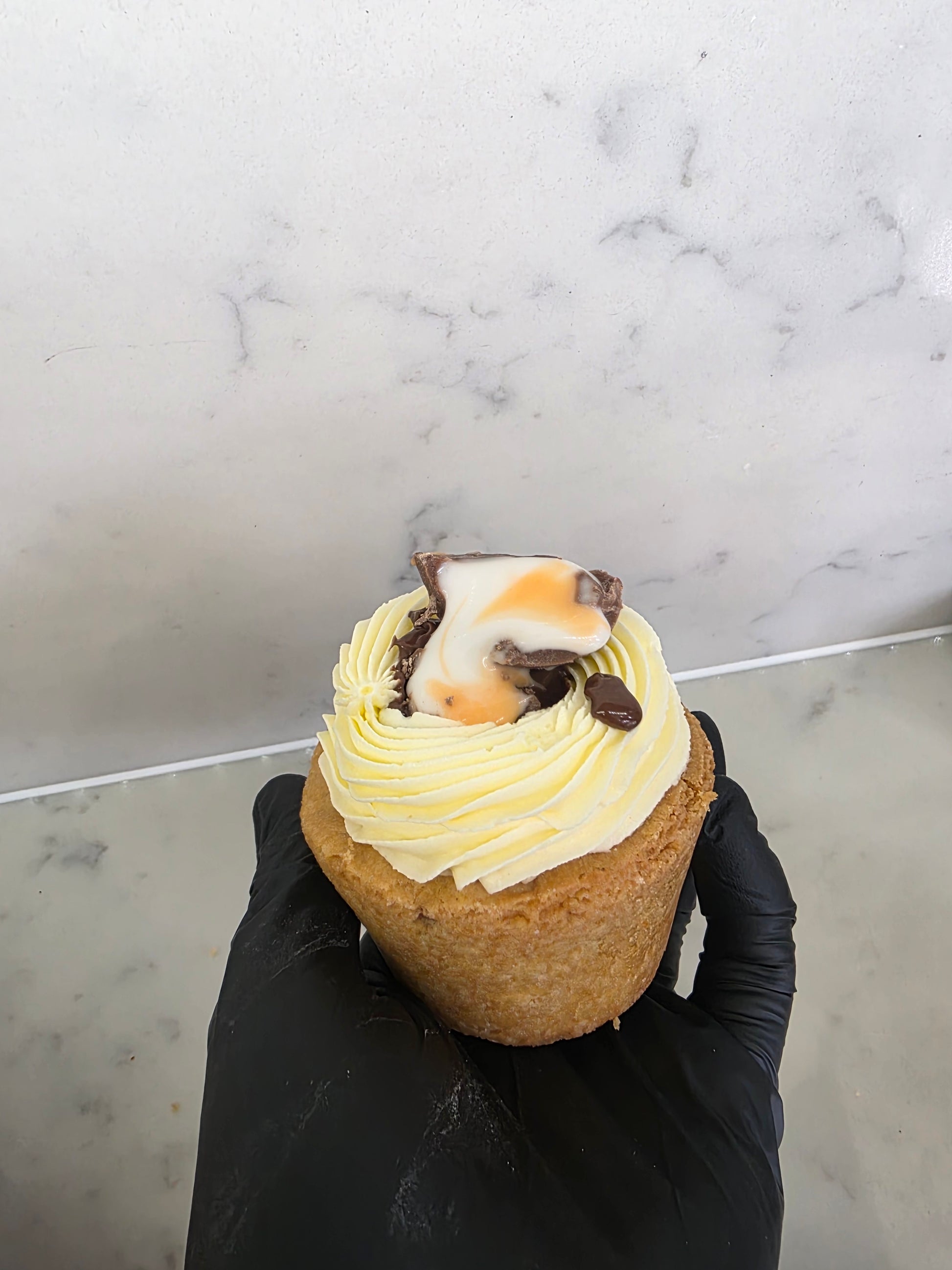 A chewy chocolate chip cookie base, topped with a swirl of creamy vanilla buttercream, filled with gooey Nutella and finished with gooey caramel nibbles