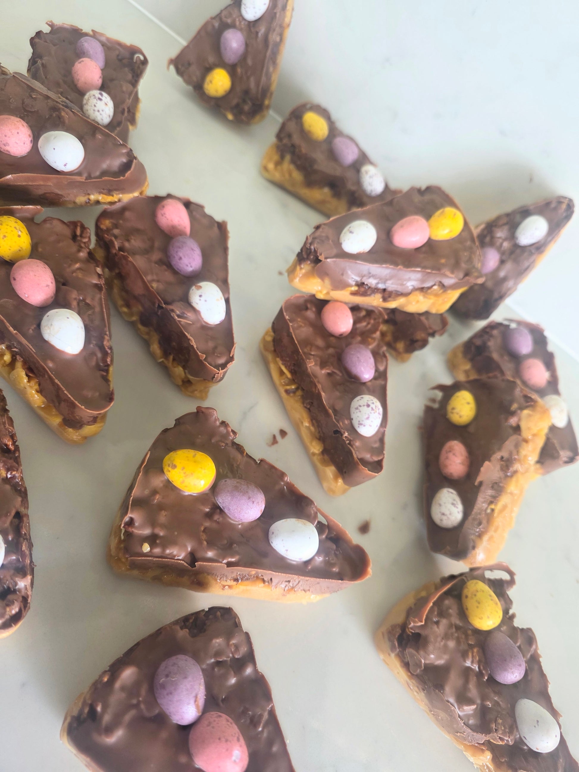 Caramel Cornflake base, Topped with Milk Chocolate cornflakes, and crowned with mini eggs.